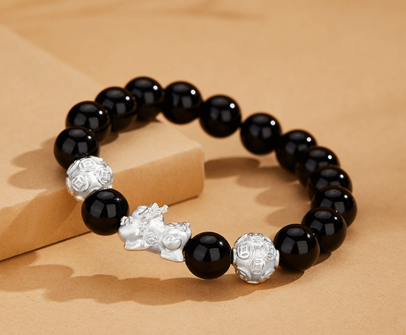 Indulge in the enchanting allure of our 999 Pure Silver Pixiu Bracelets. Crafted with 999 pure silver, a symbol of purity and nobility, along with obsidian known for its powerful energy-absorbing properties, and cat's eye stones that are believed to bring good luck and prosperity.