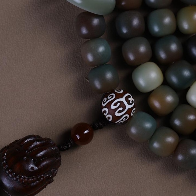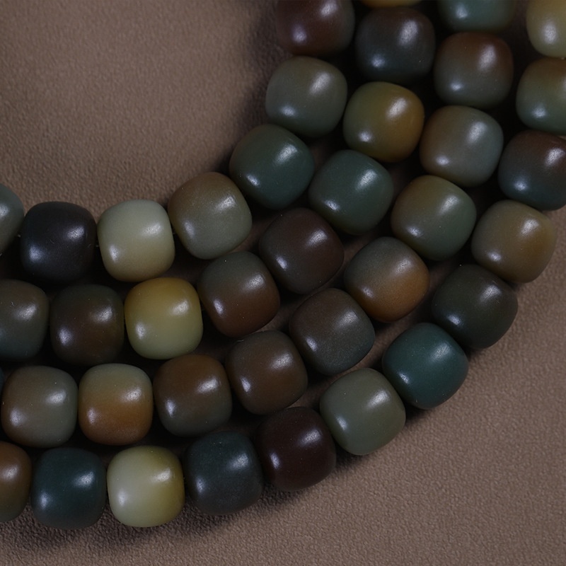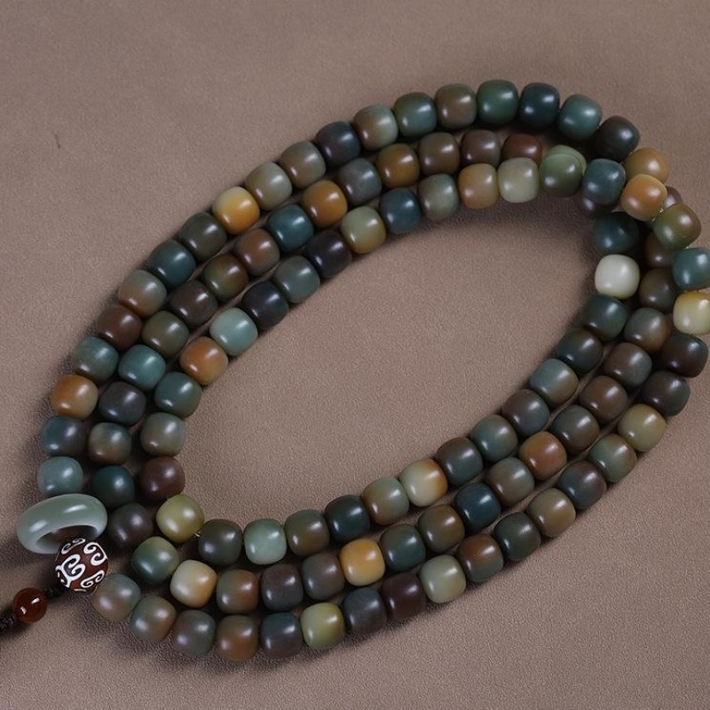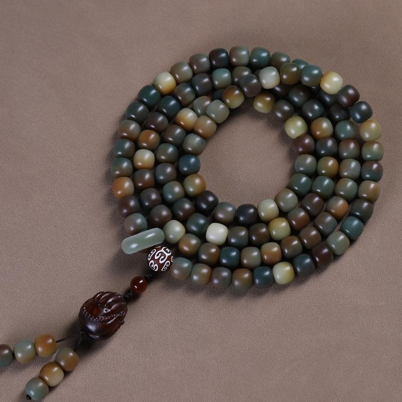 Main Beads: Weathered bodhi beads, showcasing natural color variation (earthy greens, browns, yellowish hues) with a polished, smooth texture.