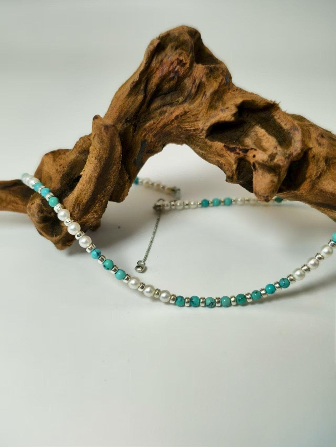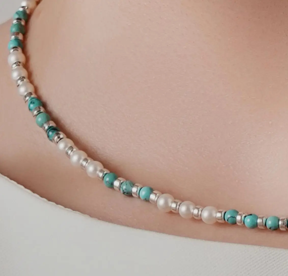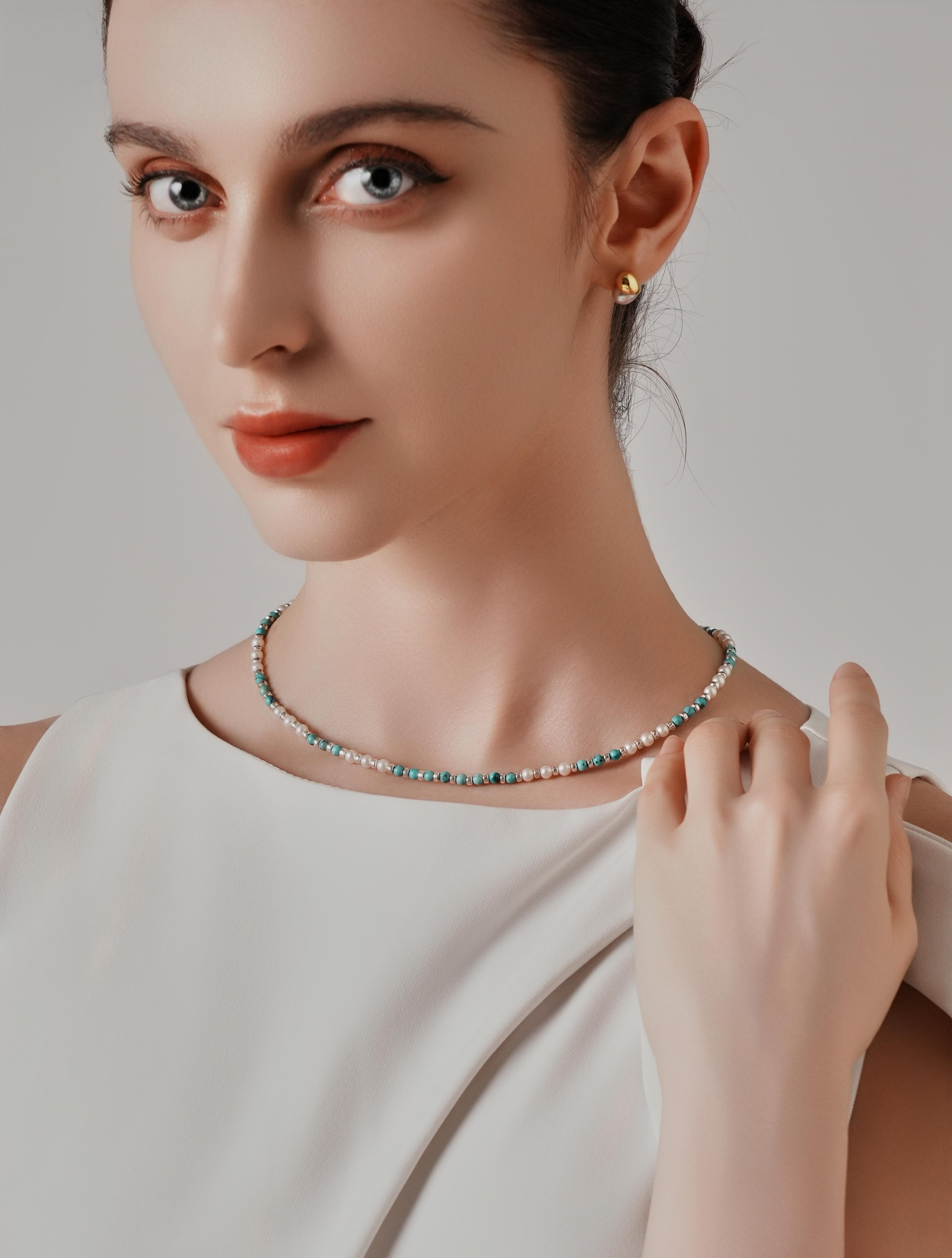 At the heart of this piece are 3-4mm natural freshwater pearls, celebrated for their soft, iridescent luster that embodies purity and timeless grace. Complementing them are vibrant turquoise stones—renowned for their rich hue and cultural significance in fostering calmness, clarity, and emotional balance.